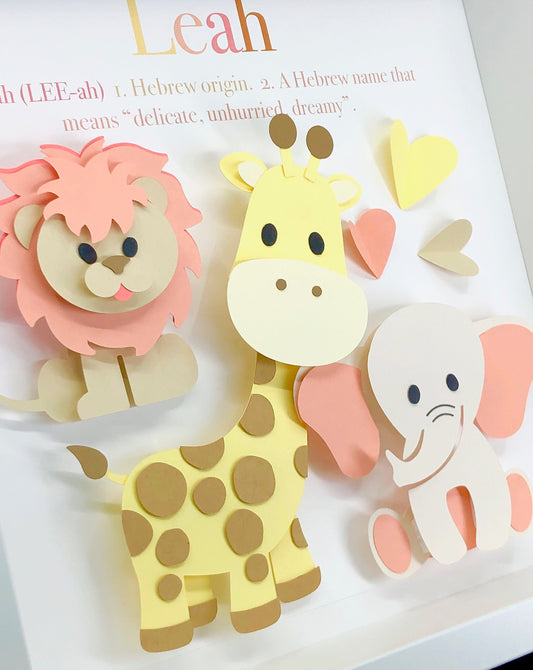 Adorable Baby Safari Name Sign with Elephant, Giraffe & Lion, Modern Zoo Animals Nursery Decor, Baby Name Gift, Jungle Baby Shower Gift