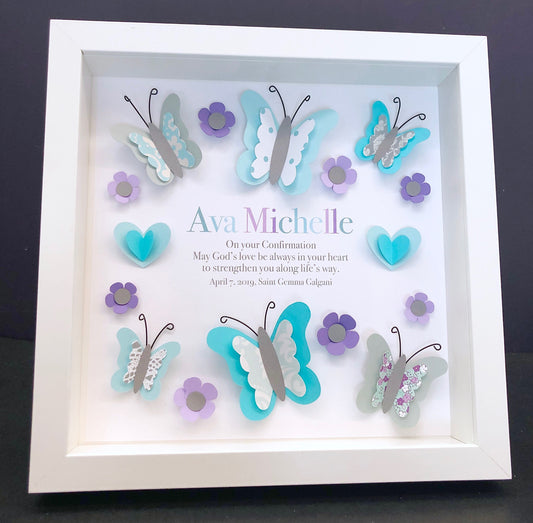 Personalized First Communion Girl Gift with Paper Butterflies & Flowers, Framed Christening, Baptism Custom Wall Art, Custom Communion Frame
