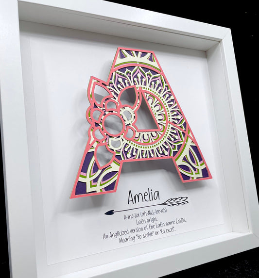 Personalized Floral Mandela Baby Initial, Baby Initial Name Frame with Origin & Meaning, Boho Mandela Nursery Decor, Personalized Baby Letter