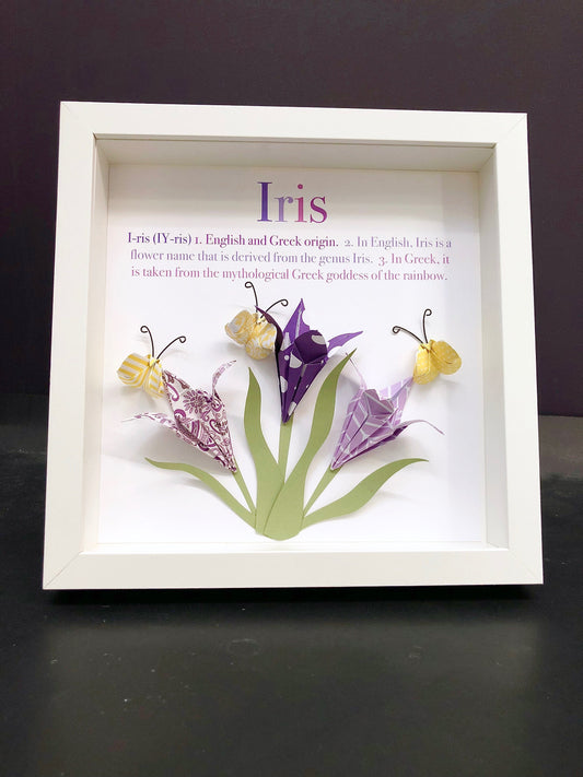 Baby Girl Name Frame with Irises, Butterflies and a Rainbow