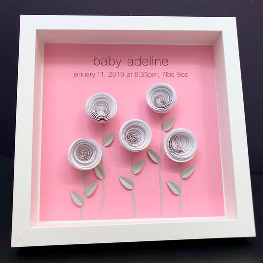 Personalized Baby Girl Name Frame with White Paper Roses on Pink