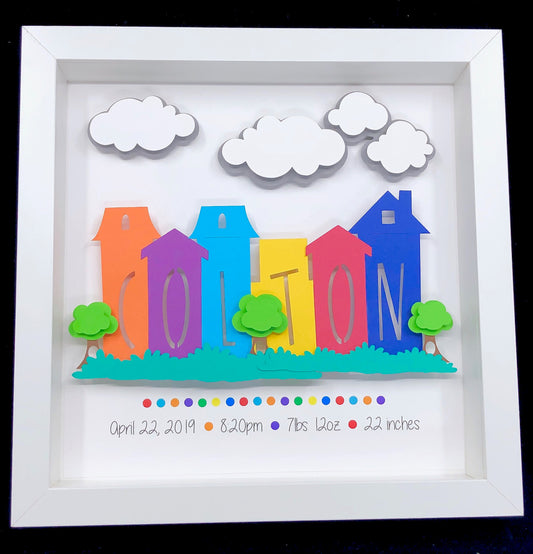 Personalized Baby Name Frame with City Streetscape in Rainbow Brights