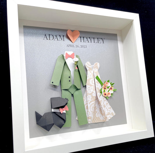 Personalized Bride and Groom Frame, First Anniversary Gift, Paper Anniversary, Wedding Gift, Origami Bride & Groom with Bouquet and Pet Dog