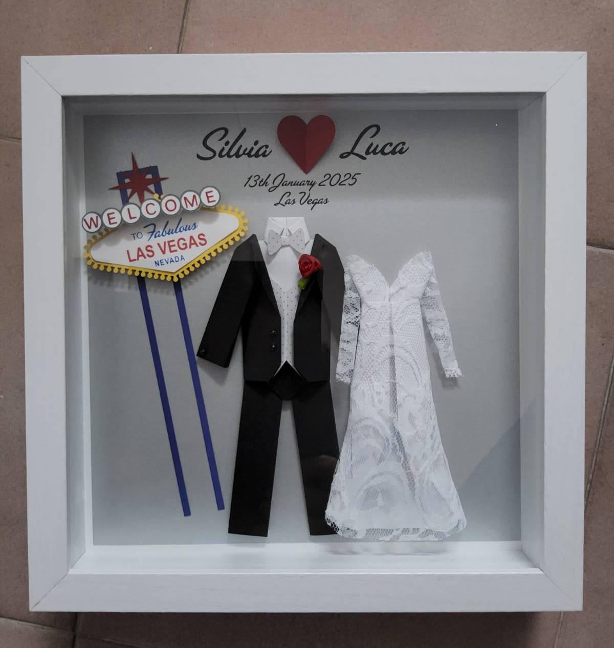 This personalized wedding shadowbox with a Las Vegas theme, features a beautiful, personalized, hand-made bride and groom with a paper replica of the iconic Las Vegas sign. A perfect and unique gift for a wedding, bridal shower, engagement, or first anniversary for any couple who got married in Vegas! They are crafted with origami paper and cardstock, then mounted onto an acid-free cardstock.